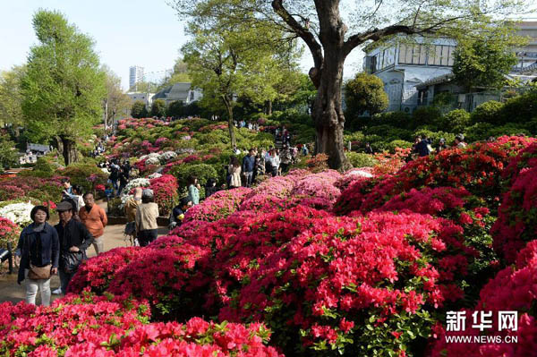 寫真は18日、日本?東京の根津神社で、満開のツツジを見る観光客。東京はこのほどツツジの開花シーズンを迎え、ツツジで有名な根津神社では約1千種類、3千株のツツジが咲き誇り、美しい姿を見せている。新華網(wǎng)が伝えた。(編集YH)