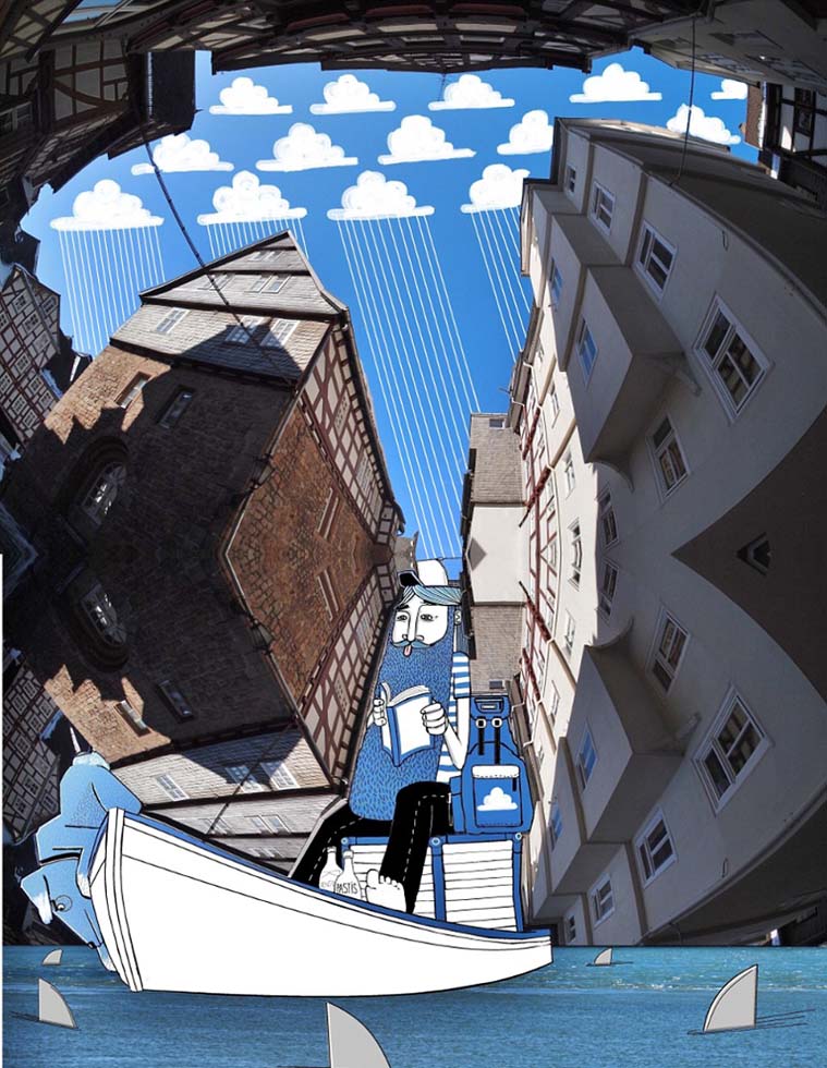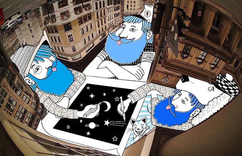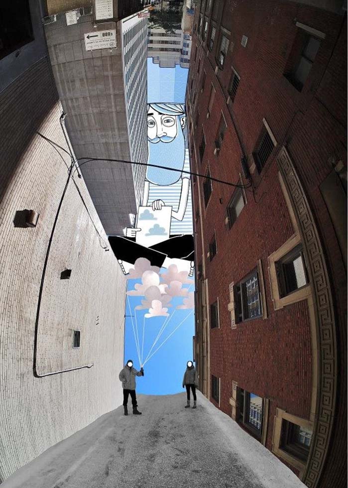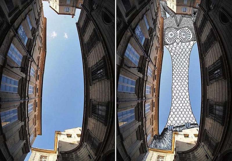 ラマディオ氏は公園や建築物の間の空き地で空の寫真を撮影し、建物の「フレーム」を作り、ユーモラスなイラストを描きこんで「空の蕓術(shù)」を生み出している?!甘|術(shù)創(chuàng)作の目的は、様々な都市の建築物や身近な日常の環(huán)境を見せてそれらを感じてもらうためだ。われわれは無限の想像力でそれらを生み出せる」。