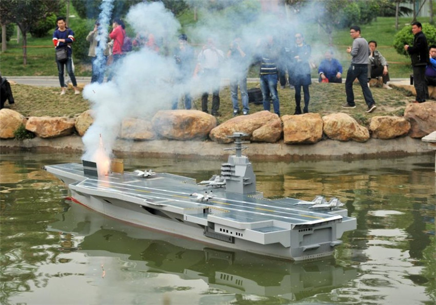 河南省鄭州市の鄭上路と西三環(huán)路の交差點西側(cè)に位置する河南省スポーツ?フィットネスパークで19日、全長6メートル、幅80センチ、重さ700キロ以上の航空母艦の模型が初の進水試験を?qū)g施し、多くの空母模型愛好家が集まった。この模型は河南省の空母模型愛好家らが設(shè)計?制作したもの。安定的な運航が可能なほか、艦首?艦尾?艦體中部のドアを開けることで、「ミサイル発射」などの任務(wù)をシミュレートできる。4枚ブレードのラジコン機が、甲板上で離著艦に2回成功した。