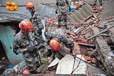 | 地震で倒壊したビルの廃墟で、中國人民解放軍第14師団地震災(zāi)害救援隊(duì)の隊(duì)員約30人が、攜帯型生命探知機(jī)などを攜え、生存者の捜索活動(dòng)にあたった。(28日、カトマンズ市內(nèi)) |