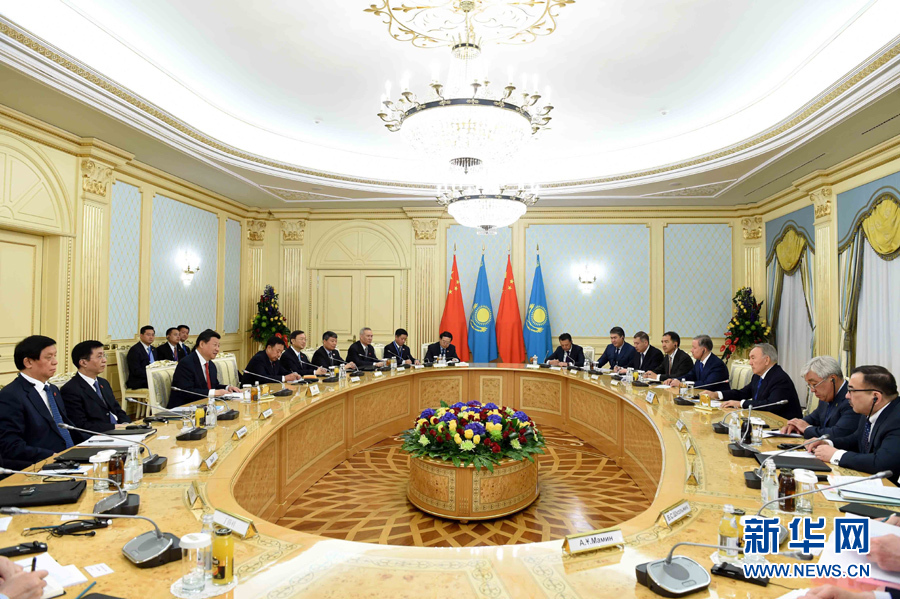 習(xí)主席は「中國とカザフスタンの包括的?戦略的パートナーシップは急速な発展の基調(diào)を呈し、各分野の協(xié)力は順調(diào)に推し進(jìn)められている。中國側(cè)はカザフスタンとの関係発展を強(qiáng)く重視しており、カザフスタン側(cè)と手を攜えて努力して、さらに多くの実際の成果が上がるよう両國関係の発展を後押しすることを望んでいる。2013年9月に私はカザフスタンを訪問した際にシルクロード経済ベルトの建設(shè)を初めて提唱した。それから1年余りで、中國?カザフスタン両國はシルクロード経済ベルトの共同建設(shè)において、すでに早期収穫を得た。中國側(cè)はこれを高く評価する。平等互恵を基礎(chǔ)にシルクロード経済ベルトの建設(shè)およびカザフスタン側(cè)の新経済政策『光明の道』との連結(jié)を推進(jìn)し、共同発展?繁栄を?qū)g現(xiàn)したい」と表明。