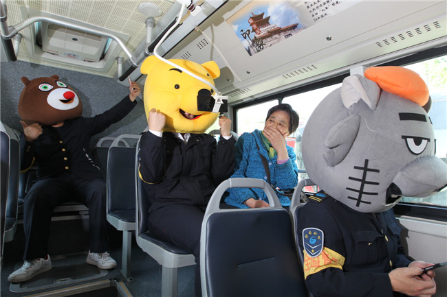 山東省、バス運転手が著ぐるみで攜帯ばかり見ないよう呼び掛ける (2)