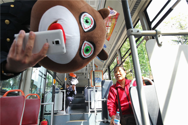 山東省、バス運転手が著ぐるみで攜帯ばかり見ないよう呼び掛ける (5)