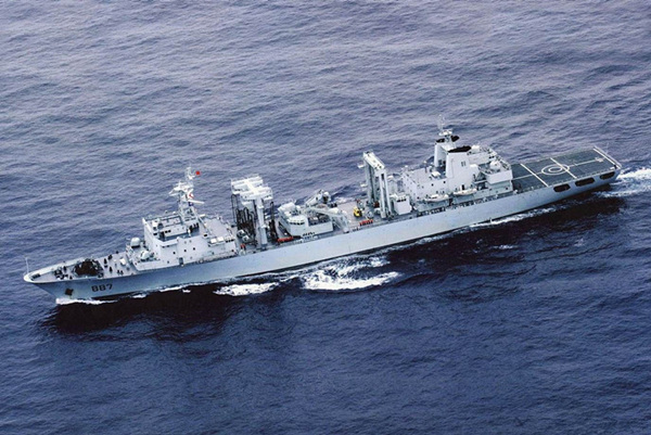 「微山湖」は福池級総合補給艦の一つである。福池級とは、夜間航行する艦艇への補給能力を持つ中國海軍で初の総合補給艦である。「微山湖」は全長171.4m、幅24.6m、喫水9m、排水量2萬3千トン、満載排水量は3萬トンである。2臺のディーゼルエンジンによる二軸駆動で、2隻以上の艦船に同時に補給することができる。主に遠洋補給に使われる。