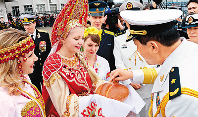 | 伝統(tǒng)的な歓迎スタイルで中國軍の將兵を出迎えるロシアの人々 |