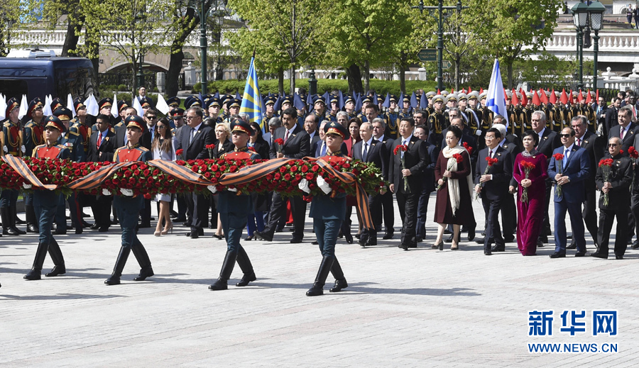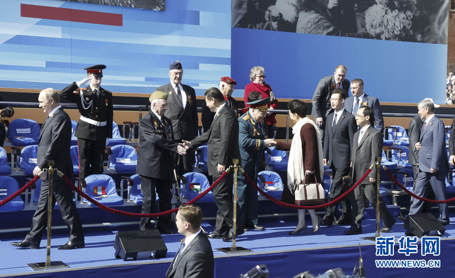 習主席と彭麗媛夫人はクレムリンに到著すると、迎え入れたプーチン大統(tǒng)領(lǐng)と握手を交わした。それからプーチン大統(tǒng)領(lǐng)に付き添われ、他の來賓とともに赤の広場まで歩き、巡閲臺に著席して、赤の広場での軍事パレードに出席した。