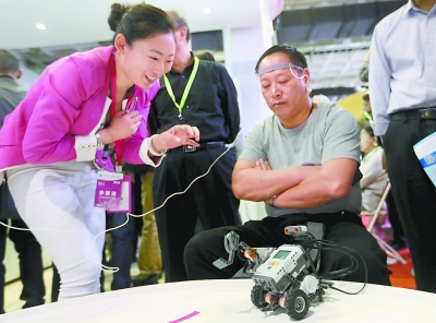 展示ブースの北京工業(yè)大學(xué)の學(xué)生によると、脳波センサが利用者の脳波を測定し、ワイヤレス通信によりこれをコンピュータとスマートカーに送る。コンピュータは脳波の記録をとり、スマートカーは脳波データにより利用者の集中力を分析し、車の動(dòng)きを制御する。