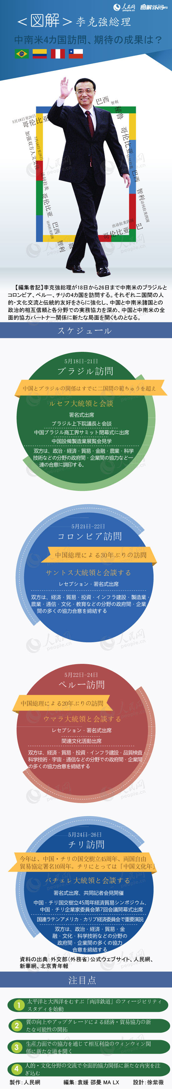 李克強(qiáng)総理が18日から26日まで中南米のブラジルとコロンビア、ペルー、チリの4カ國を訪問する。それぞれ二國間の人的?文化交流と伝統(tǒng)的友好をさらに強(qiáng)化し、中國と中南米諸國との政治的相互信頼と各分野での実務(wù)協(xié)力を深め、中國と中南米の全面的協(xié)力パートナー関係に新たな局面を開くものとなる。人民網(wǎng)は今回の外遊の注目點(diǎn)を図解でまとまった。(編集MA、LX)