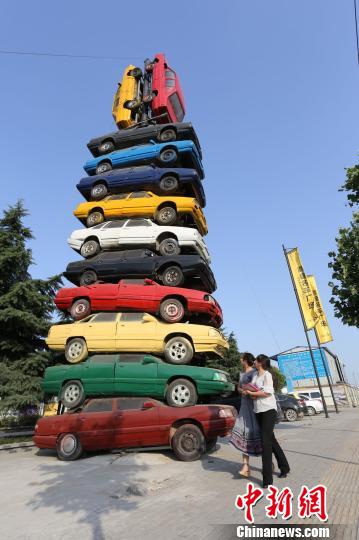 この「7色の自動(dòng)車の塔」は「鼎盛名車」という名前の販売企業(yè)がデザインし、製作した。販売ディレクターの李氏によると、同社は金岱自動(dòng)車産業(yè)パークにあるため、自動(dòng)車文化と関連のあるランドマーク的なものを建てたいと考え、自動(dòng)車修理工場(chǎng)から廃車12臺(tái)を持ってきて7色に塗りわけ、「7色の自動(dòng)車の塔」を作った。また、安全上の問題はないという。(編集YH)