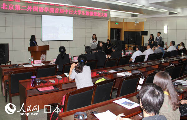 18日午後、北京第二外國語學(xué)院観光管理學(xué)部と北京第二外國語學(xué)院日本語學(xué)部の共催の「第1回中日大學(xué)生観光企畫大會」が北京で開かれた。參加者24人が6チームに分かれてそれぞれ作成した日本観光計(jì)畫書を発表した。