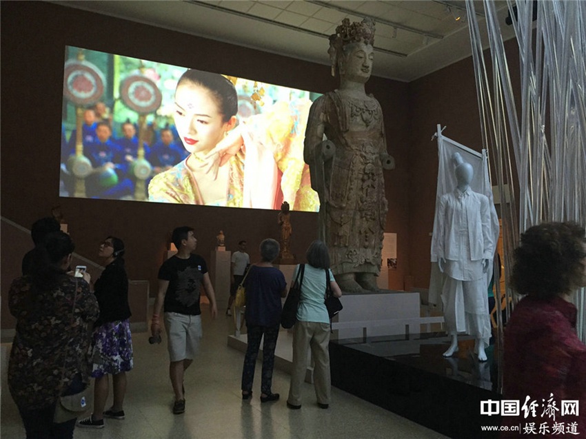 メトロポリタン美術(shù)館の中國館のメインロビーに入ると、竹林をデザインした巨大なオブジェが飾られている。これは、ジャンポール?ゴルチエがプラスチック製の薄い膜を使用して、中國の竹林を再現(xiàn)したものだ。壁には章子怡(チャン?ツィイー)が竹林の中で、袖で太鼓を打ち、舞踏を舞いながら戦う中國映畫「LOVERS」(原題:十面埋伏)の戦闘シーンが大きく投射されてリピート再生されており、足を止めて動(dòng)畫に見入り、寫真を撮る観光客も少なくなかった。