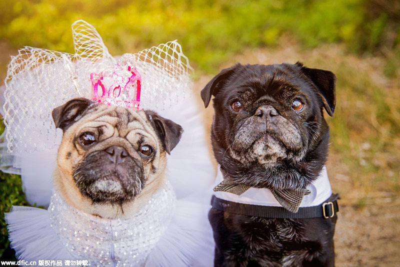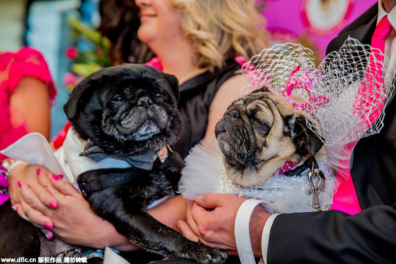 オーストラリア?メルボルンでこのほど、ユニークな「結(jié)婚式」が執(zhí)り行われた??蓯郅椁筏?匹のパグ犬が、家族や友人に祝福されながら、めでたく結(jié)婚式を挙げたのだ。
