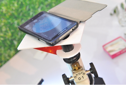 理科の授業(yè)で顕微鏡を使ったことがあるだろうが、これを使えば非常に小さなものでも見(jiàn)ることができる。しかし使用の際には片方の目を閉じ、もう片方の目を接眼レンズに近づけなければ物體を見(jiàn)ることができない。しかも教員は授業(yè)の際に、すべての生徒に顕微鏡を1臺(tái)ずつ準(zhǔn)備しなければならない。今年の科學(xué)技術(shù)ウィークには、「顕微鏡用撮影器具」と呼ばれる発明品が登場(chǎng)した。これを接眼レンズに取り付け、その上に攜帯電話(huà)のカメラが重なるように置けば良い。攜帯電話(huà)が顕微鏡の畫(huà)面になり、プロジェクターやテレビにつなげて映し出すこともできる。これは現(xiàn)在の顕微鏡を使った教育の不足を大きく改善した。(編集YF)