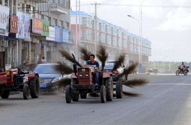 (6)黒竜江省漠河県のこの男性は、12本の箒を車の後ろに取り付け、清掃車を作った。