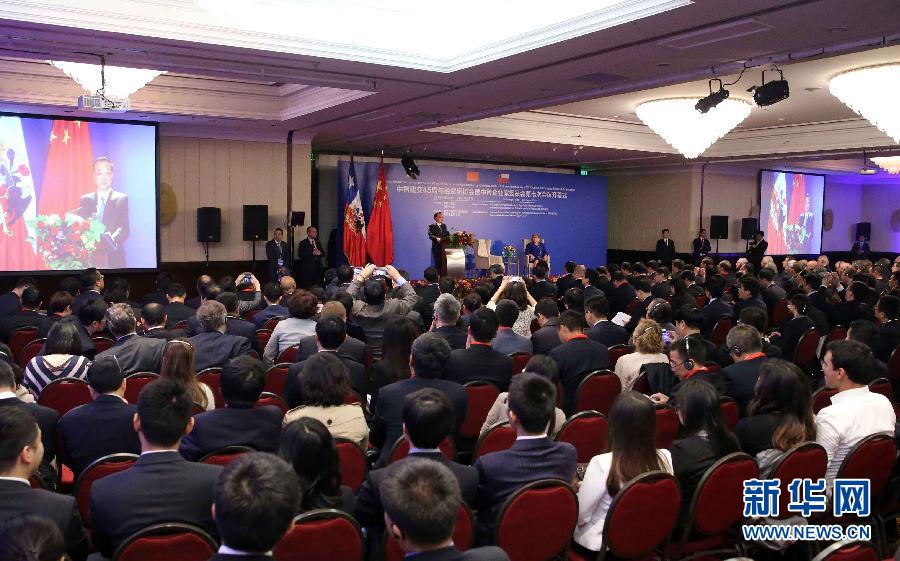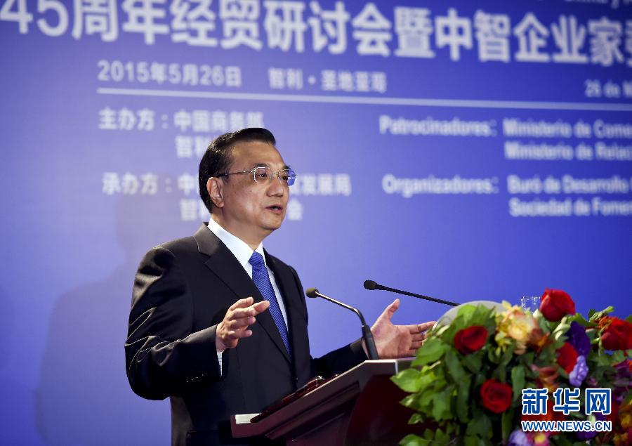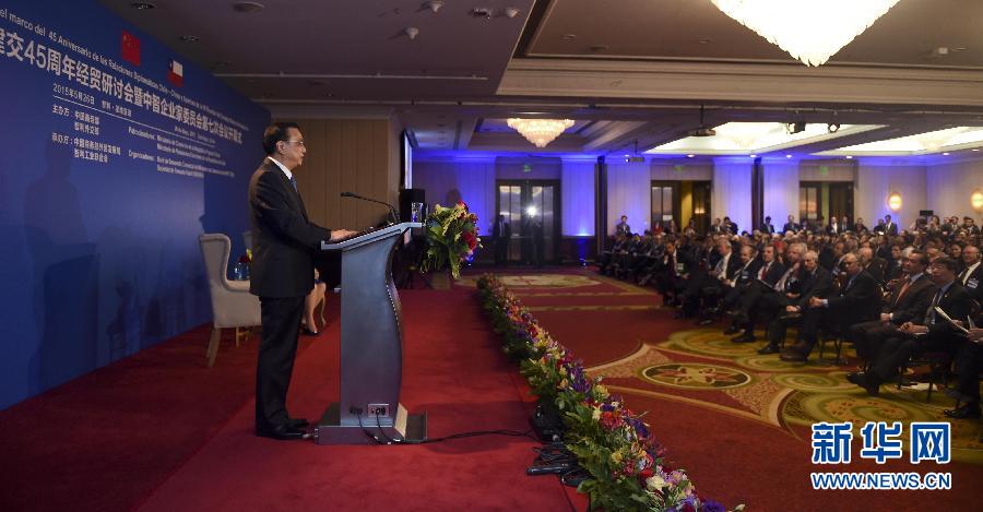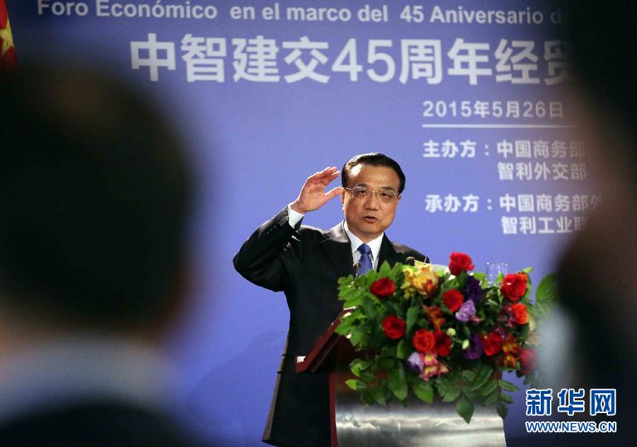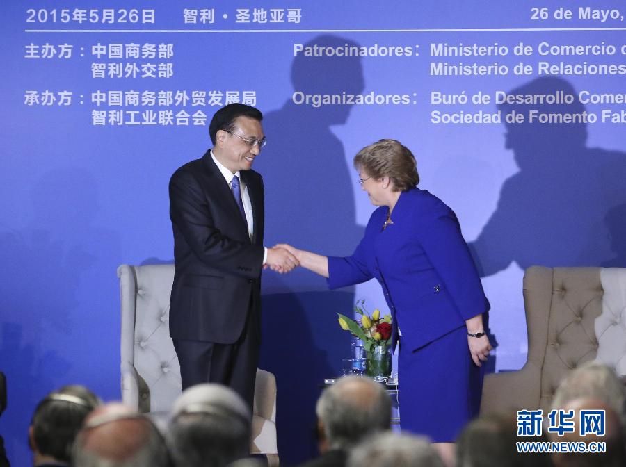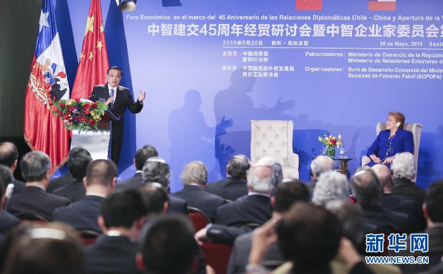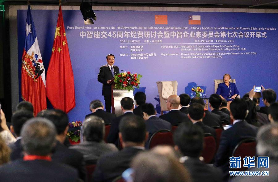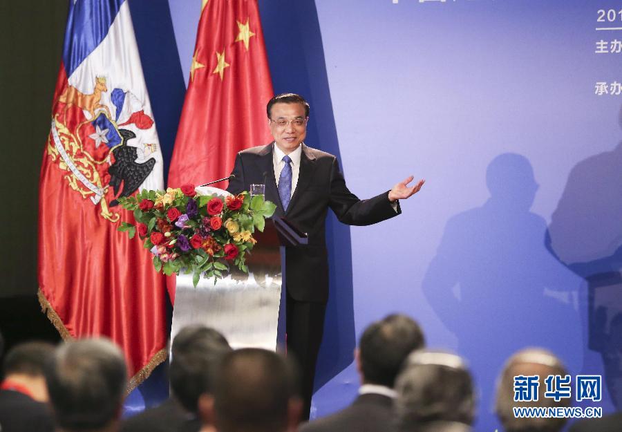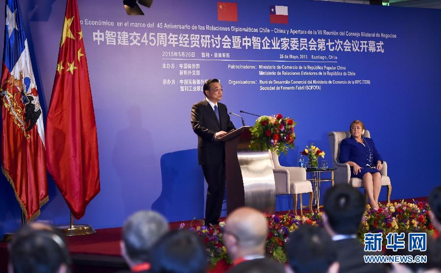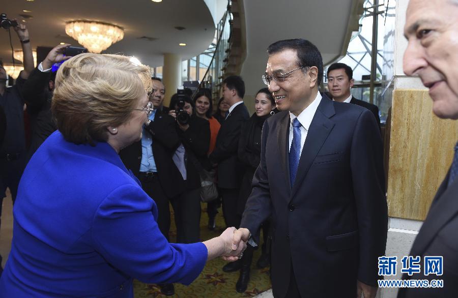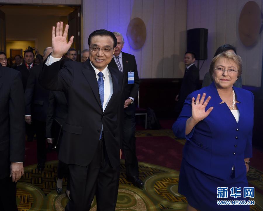 李克強(qiáng)総理は現(xiàn)地時(shí)間26日午前、サンティアゴの宿泊ホテルで、チリのバチェレ大統(tǒng)領(lǐng)と共に中國(guó)?チリ國(guó)交樹立45周年ならびに中國(guó)?チリ実業(yè)家委員會(huì)第7回會(huì)議開(kāi)幕式に出席し、式辭を述べた。