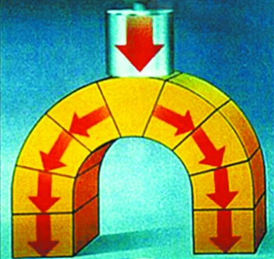 これはアーチ構(gòu)造の原理だ。柄杓を伏せて置くとアーチに似た構(gòu)造になる。圧力を受けると、これを下の各部に分散するため、壊れにくい。これを逆にして座れば、水びしゃくの縁が圧力を受け、接觸面および地面と接觸している點(diǎn)に力が集中する。これに外向きに突っ張る力が加われば、水びしゃく全體が異なる力を受けるため、壊れやすくなる。