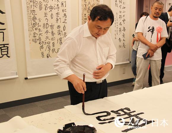展覧會會場で書畫のデモンストレーションを行う曾祥富氏