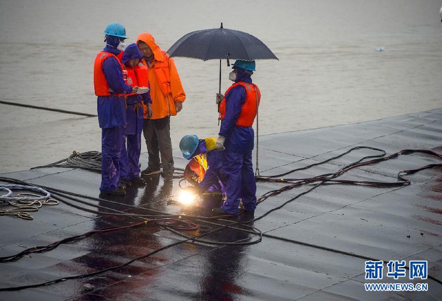 湖北省荊州市の長江で客船「東方之星」が転覆したことで、4日午前8時ごろ、救援者が水面から出た船底に3カ所目の穴を開けて、生存者の捜索を始めた。