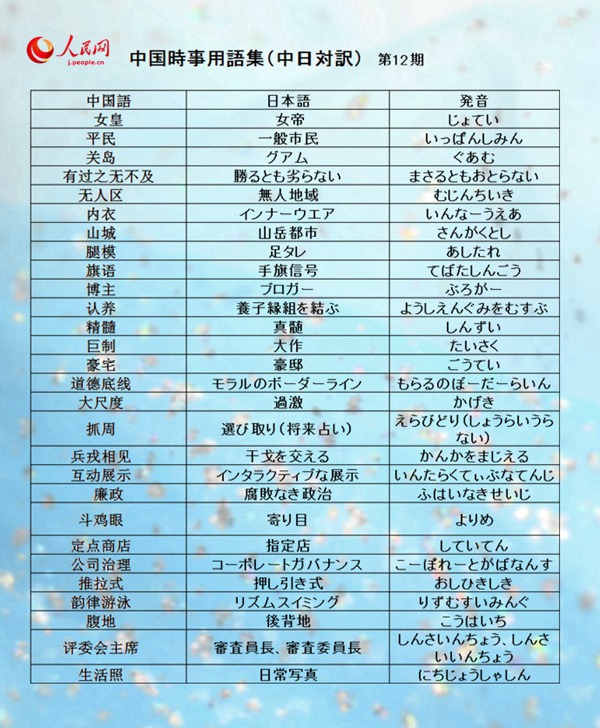 人民網(wǎng)日本語版は、中國の新聞報(bào)道を翻訳した記事を理解する上での手助けとなるため、「中國時(shí)事用語集(中日対訳)」を開設(shè)しました?!钢袊鴷r(shí)事用語集(中日対訳)」には中國の新聞報(bào)道に使用される政治?経済?社會?文化?法律などの用語を幅広く収録し、定期的に更新する予定です。読者の皆様のお役に立てれば幸いです。