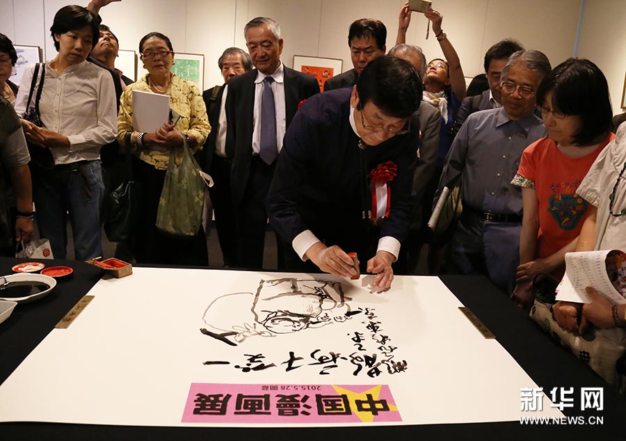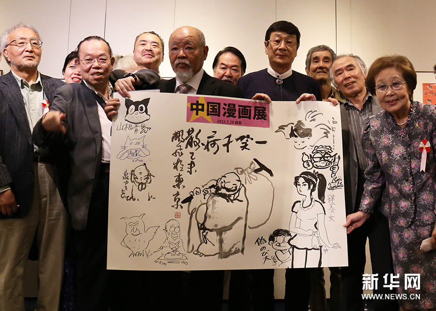開幕式では、観衆(zhòng)が注目する中、漫畫家徐鵬飛氏が作畫のデモンストレーションを行い、わずか數(shù)分間で、古裝を身に著けて笑っている、躍動感溢れる水墨畫の老人が紙の上に現(xiàn)れた。その後、同開幕式に出席した日本の漫畫家たちは、漫畫のスタイルで中日友好交流を記念するため、次々にこの笑っている中國の老人を取り囲むように、それぞれさまざまなスタイルのユニークな漫畫のキャラクターを描いた。中日両國の漫畫は、もともと一方がシリアスで社會的であるのに対して、もう一方が活発で、娯楽的なものであった。しかし、結(jié)局のところは、「笑いで世の中のあらゆる憂いや悲しみを吹き飛ばす」という同じような蕓術(shù)のスタイルで同じ生活態(tài)度を表現(xiàn)している。
