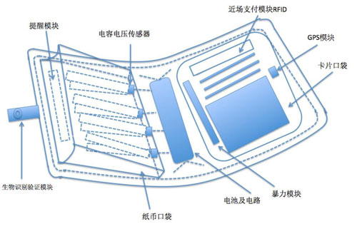 百度の開発計(jì)畫によると、スマート財(cái)布にはGPS、生體認(rèn)証、センサーなどのモジュールが搭載される予定だ。これは、財(cái)布に小型コンピュータを搭載するようなもので、安全性を大幅に向上させることができる。例えば內(nèi)蔵されているセンサーと攜帯電話のアプリを結(jié)びつければ、距離が設(shè)定値より離れた場合にアプリが通知を出す。盜まれた場合は警報を出し続ける。これをオフにするためには、攜帯電話のアプリを使用しなければならない。仮に他者が無理やり財(cái)布を開こうとした場合、スマート財(cái)布は塗料を噴射し磁気を発するといった物理的な手段により、財(cái)布の中のクレジットカード、身分証、その他の証明証を処分し、利用者の財(cái)産の損失を防ぐ。
