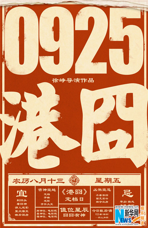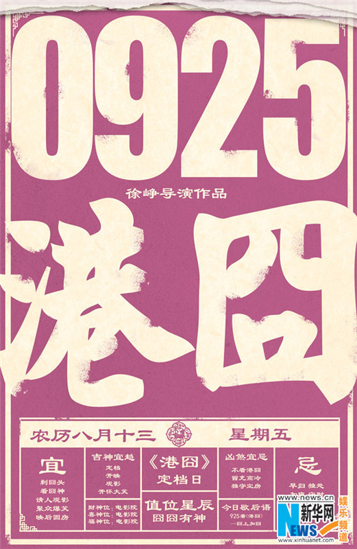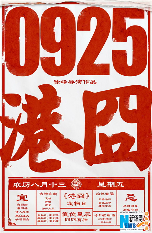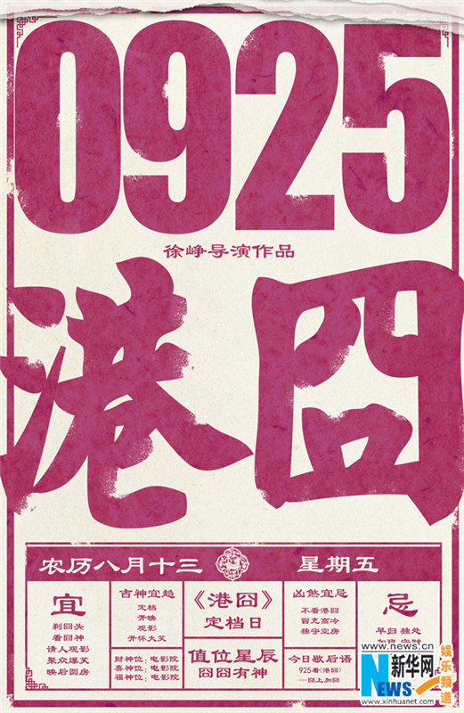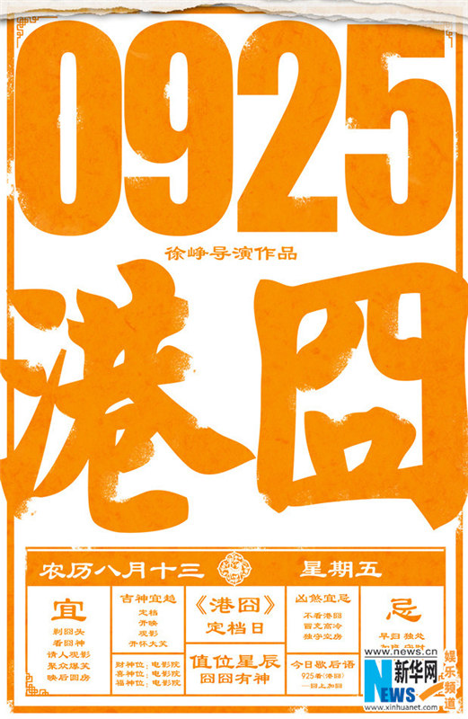 ポスターには、9月25日の公開時期とタイトルが大きく記されている。ポスターの下段には、9月25日當(dāng)日の風(fēng)水指南が書かれているなど、細(xì)やかなデザインが施されている。このほかにも、開運(yùn)行動として、「頭を坊主にする」(徐崢は坊主頭)「囧神を見る」「人を誘って映畫を見る」「みんなで集まって爆笑する」「映畫を見てから夫婦生活を営む」などと記され、映畫の公開當(dāng)日に観衆(zhòng)が採るべき行動を巧妙にデザインの中に取り込んでいる。また、兇を呼び込む行動として、「早く家に帰り、家で1人寂しく過ごす」「殘業(yè)をし、守銭奴となる」「オタクと化し、大酒を飲む」「ネットでファイルをダウンロードする」を上げており、明確に、9月25日は映畫館に行き「港囧」を見るべきであると勧めている。公開時期が発表されたことで、次は、同映畫のキャスト陣に熱い視線が集まっている。(編集MZ)