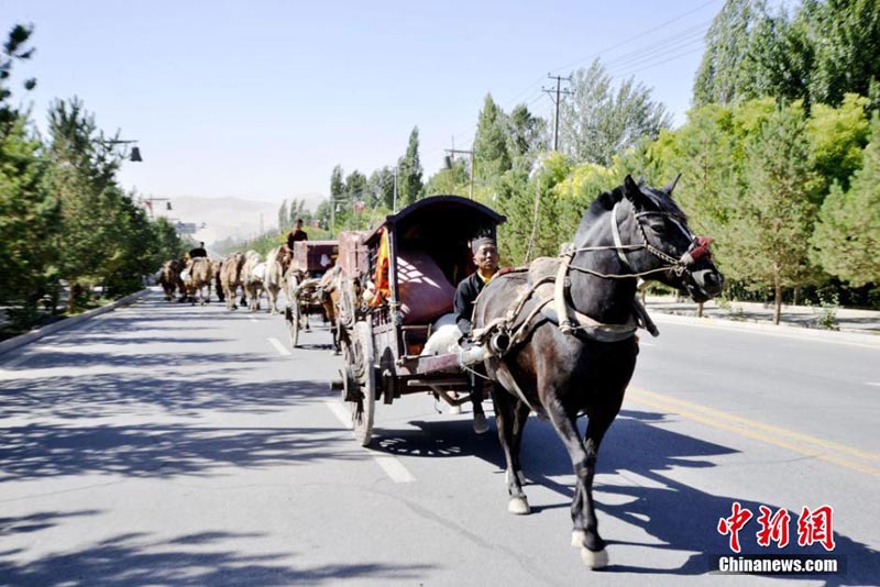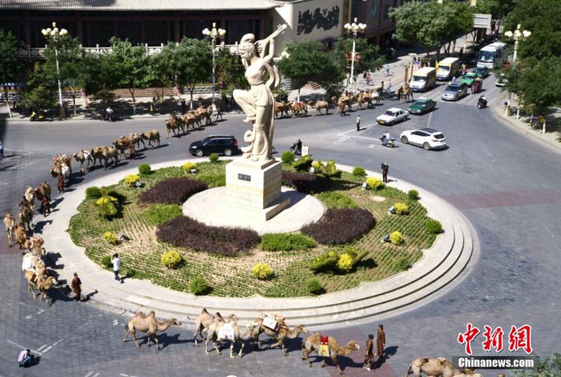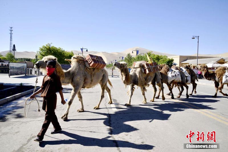 陝西省から出発した大型ラクダキャラバンが10日午前、徒歩で2千キロ近くを走破し、甘粛省河西走廊最西端の昔のシルクロードの拠點(diǎn)、敦煌に到著した。1年半かけて昔のシルクロードを踏破する予定の同キャラバンは陝西省、甘粛省、青海省、新疆維吾爾(ウイグル)自治區(qū)などを通り、最終的にはカザフスタンまで1萬5千キロ以上を旅する。ラクダキャラバンは100頭以上のラクダ、復(fù)元した昔の馬車3臺(tái)、馬3頭、支援車両4臺(tái)からなり、キャラバン全長(zhǎng)は約500メートルに達(dá)した。中國(guó)新聞網(wǎng)が伝えた。(編集YH)