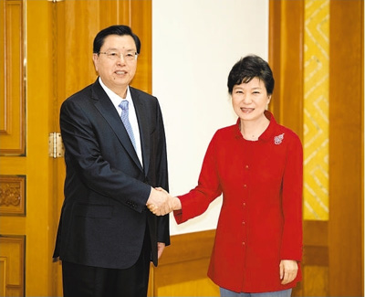 樸大統(tǒng)領(lǐng)は習(xí)主席へのメッセージを張委員長に伝え、張委員長の訪韓を歓迎した。さらに、「このほど署名された韓中自由貿(mào)易協(xié)定は、2國間の経済貿(mào)易協(xié)力を促進するものであり、両國の未來に向けた発展の基礎(chǔ)を固めた。韓國は引き続き両國の各分野での実務(wù)協(xié)力を拡大し、韓中戦略的協(xié)力パートナーシップの新たな発展を絶えず推進し、東北アジアの平和と安定?繁栄を共に促進していきたい」と述べた。雙方はまた、関心を寄せる問題について意見を交換した。