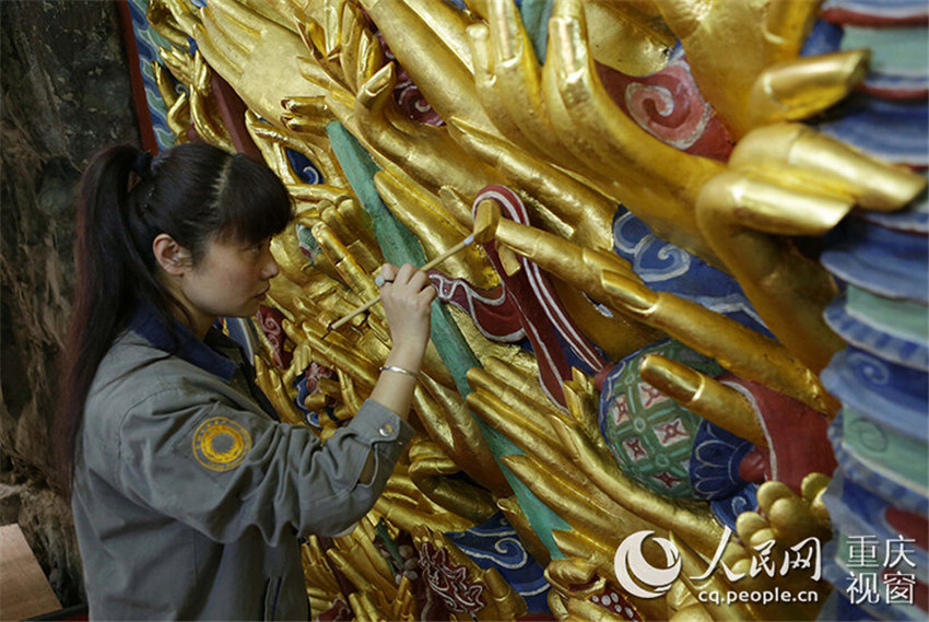 千手観音菩薩が作られたのは、南宋の淳熙から淳祐(1174-1252)の78年間。高さ7.7メートル、幅12.5メートルで、雕塑、金箔、彩色上絵が一體となった中國最大の摩崖石刻(天然の石の崖に掘られたもの)だ。2008年6月、中國國家文物局が修復(fù)作業(yè)を認(rèn)可した。作業(yè)が始まり、明や清の時(shí)代に行われた修復(fù)作業(yè)時(shí)に施された金箔や彩色上絵が剝がされると、これまでは厳しい表情だった千手観音菩薩は、実は微笑んでおり、親しみやすい表情をしていることが分かった。