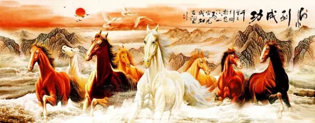 疾走する馬の生き生きとした姿は、人間に奮闘する力を與え、前進(jìn)する喜びを感じさせる。萬馬奔騰の絵は成功を表す。