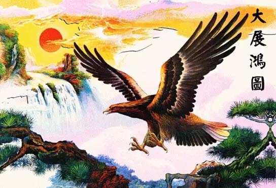 大展宏図とは広大な計(jì)畫や構(gòu)想を?qū)g施することを指す。雄の鷹が羽根を広げたこの絵は、萬里を行く鵬、大展宏図の寓意を持つ。