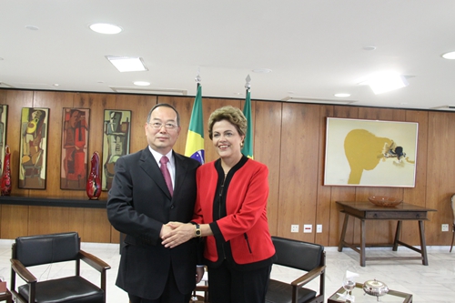 握手をするブラジルのルセフ大統(tǒng)領と人民日報社の楊振武社長