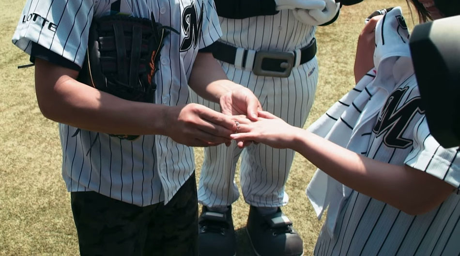 花島さんと戀人の舘石さんはいずれも千葉ロッテマリーンズの大ファンで、2人は交際して7年になる。今回、花島さんは球団主催の「始球式プロポーズ」イベントに參加を申し込み、2人がよく行く球場で彼女にプロポーズした。