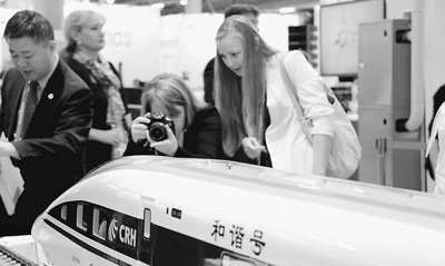 寫(xiě)真 モスクワ國(guó)際イノベーション発展フォーラムで、中國(guó)が展示した高速鉄道の模型を見(jiàn)るロシア人來(lái)場(chǎng)者。