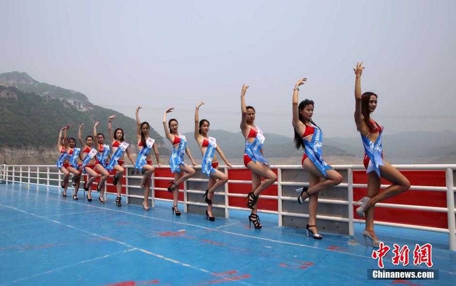 河南省済源市の黃河三峽のフェリーで22日、2015年インターナショナル?ツーリズムの海峽両岸(中國(guó)大陸部と臺(tái)灣地區(qū))イメージ大使がビキニ姿で抜群のスタイルを披露し、美腳をフェリーの手すりに高々と掲げて見せた。中國(guó)新聞社が伝えた。(編集YH)