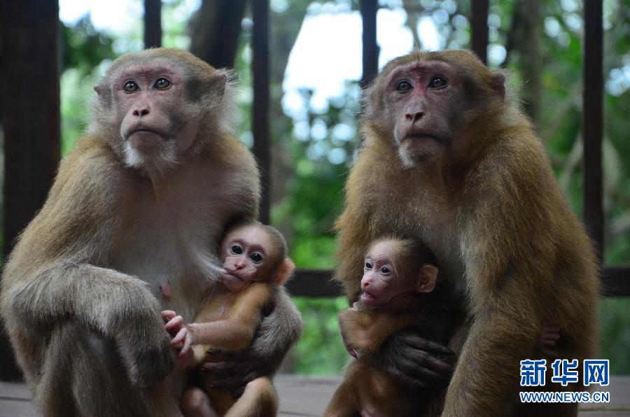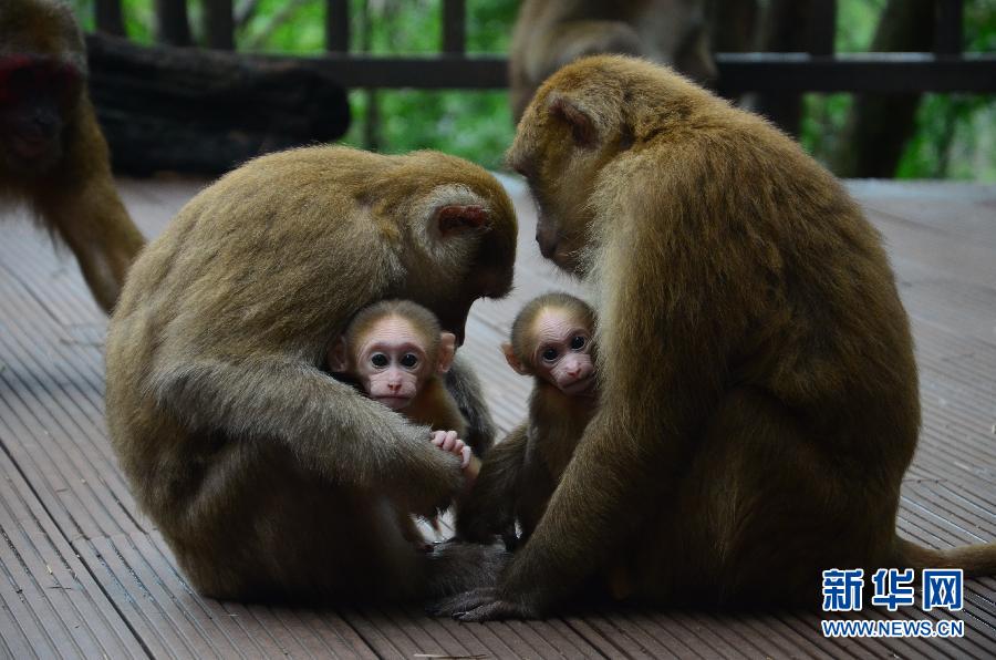 寫真は25日、子どもを抱いて一緒に座る2匹のアカゲザルの母親。雲(yún)南省普洱(プーアル)市太陽河國家公園で飼育されているメスのアカゲザル2匹がこのほどそれぞれオスの赤ちゃんザルを1匹ずつ出産した。飼育係によると、母親ザル2匹は同じ母親から生まれた姉妹で、普段も群れの中で仲がよいという。子どもを生んだ後はさらに仲睦まじさが増して、よく子ザルを抱きながら一緒に寄り添っているという。新華社が伝えた。(編集YH)