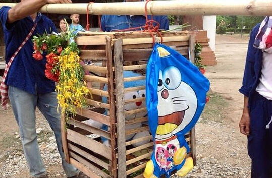 降水量が足りないことから、今年のタイは干ばつの被害を受けている。そのため同國北部プレーのある村では伝統(tǒng)的な雨乞いの儀式を行った。儀式では村の住民がネコを入れた檻を擔(dān)ぎ、雨を祈りながらネコに水をかけていた。もっともネコにこんなに水をかけると病気になってしまうこともあるため、今年の儀式ではネコの代わりにドラえもんが登場した。中青網(wǎng)が伝えた。(編集YH)