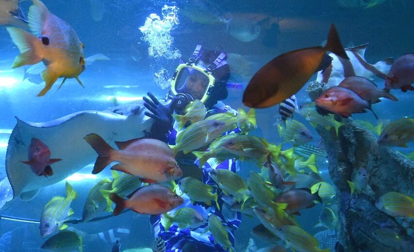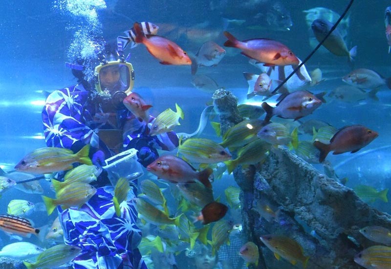 イベントでは女性ダイバーが色鮮やかな浴衣姿で水中に潛り、魚に餌付けした。ダイバーが水槽に入ると、色とりどりの魚が彼女を取り巻いて泳ぎまわり、魚の群れと鮮やかな浴衣が一體となって美しい光景を見せた。