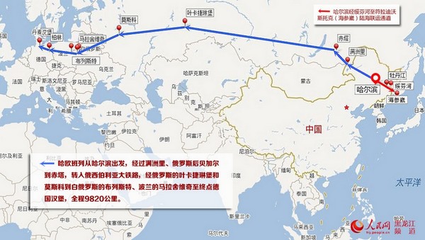 第1便の列車は6月13日に哈爾濱を出発し、內(nèi)蒙古(モンゴル)自治區(qū)満洲里市を経てロシア國內(nèi)に入り、バイカル地方、チタを通り、シベリア鉄道に接続し、エカテリンブルク、モスクワ、ベラルーシ、ポーランド?マワシェビチェを通過し、ハンブルクに到著した。