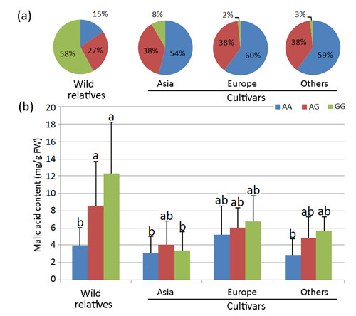 遺伝子が「ma1ma1」の品種の場(chǎng)合、有機(jī)酸の含有量が高い。これはMa1遺伝子が、リンゴの酸味を制御する唯一の決定的な要素ではないことを意味する。(編集YF)