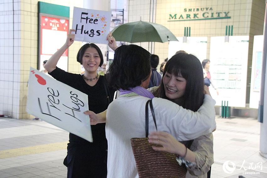 若者と外國人観光客が集まる渋谷で行われたフリーハグ活動は、道行く人々の注目を集めた。多くの日本の人々や外國人観光客が同活動に參加し、主催者側(cè)の中日の若者とフリーハグを行った。まさに梅雨の真っ只中の東京では同日小雨が降っており、日中両國の若者は雨に濡れながらも渋谷の街に立ち、道行く人々をハグで迎えた。