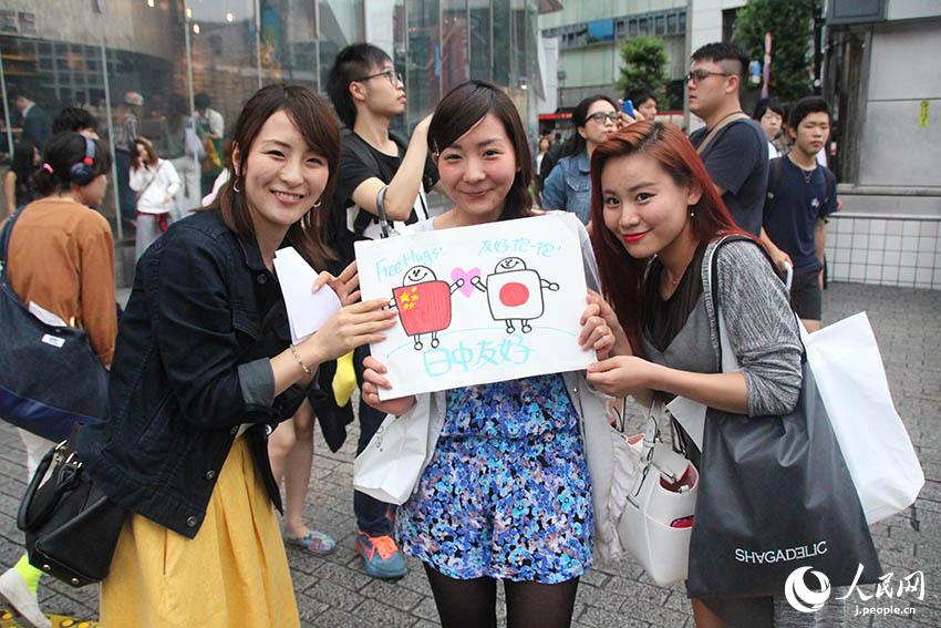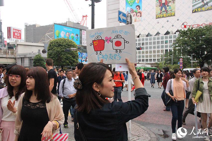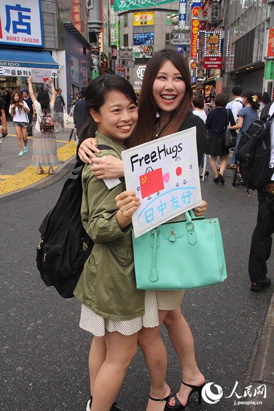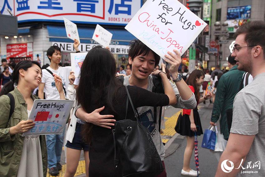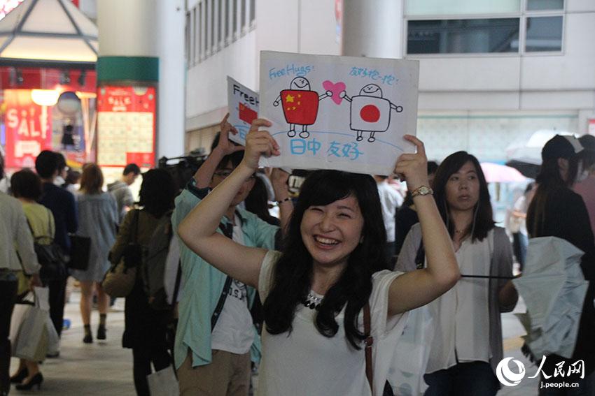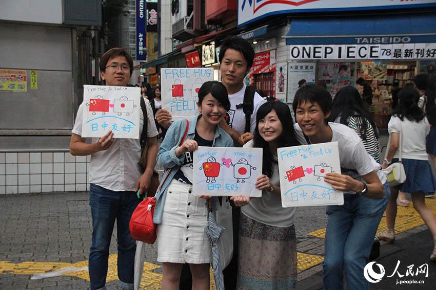 中日両國の若者十?dāng)?shù)人による「中日友好フリーハグ」活動が5日午後、人通りの多い東京?渋谷の街で行われた。同活動は在日中國人留學(xué)生が発起人となって始めたもので、「中日友好」と書かれた看板を掲げ、道行く見知らぬ人にハグをして中日友好を態(tài)度で示し、積極的に両國の友好交流を呼びかけた。人民網(wǎng)が伝えた。