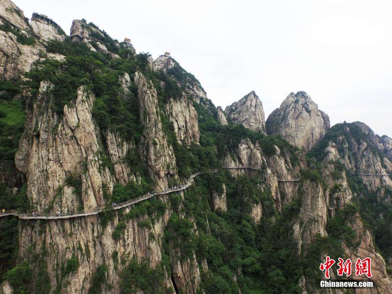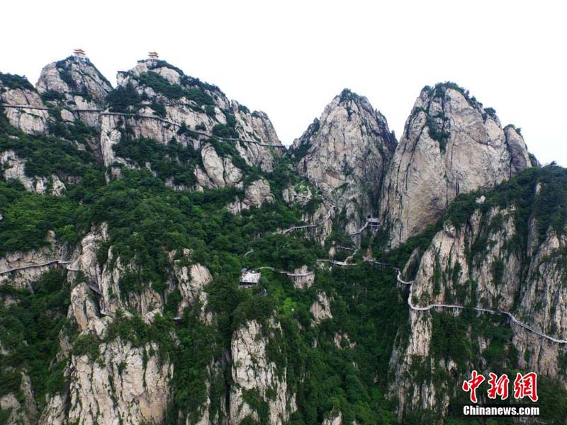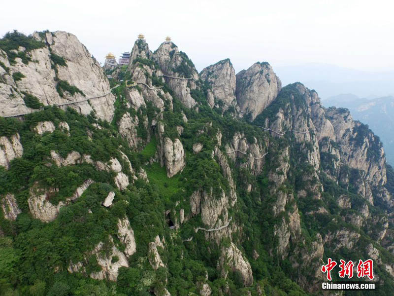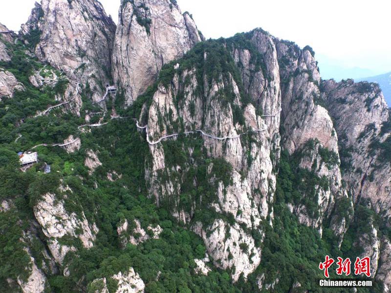 中國河南省西部を北西から南東に走る山脈伏牛山の主峰「馬鬃嶺」(海抜2200メートル)。頂を上空から俯瞰すると、その山腰に曲がりくねった「羊腸」のような総延長1萬メートルほどの桟道が立っており、まるで山々に降り注いだ玉の飾られた帯のようで、そして黃金色に輝く亭が空中に架けられている景色に圧倒される。中國新聞社が5日伝えた。(編集IM)