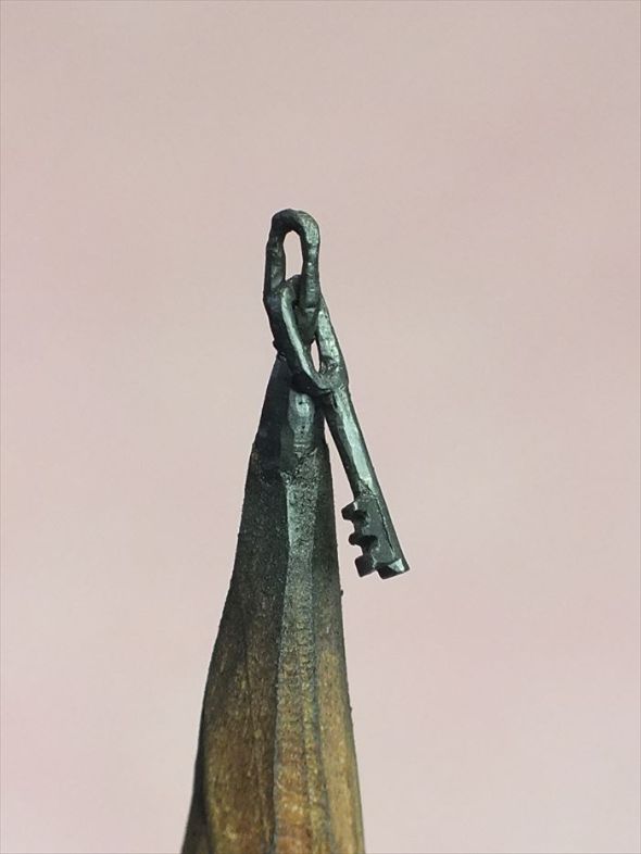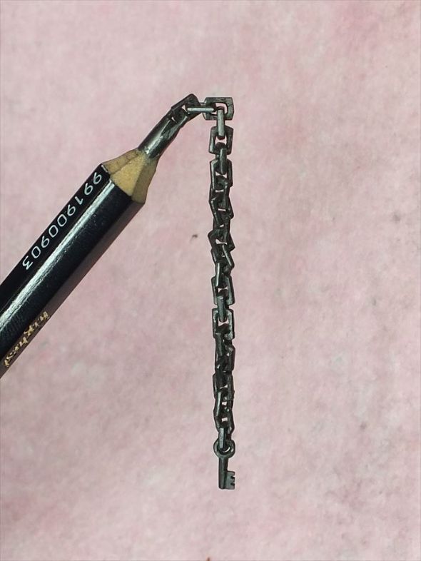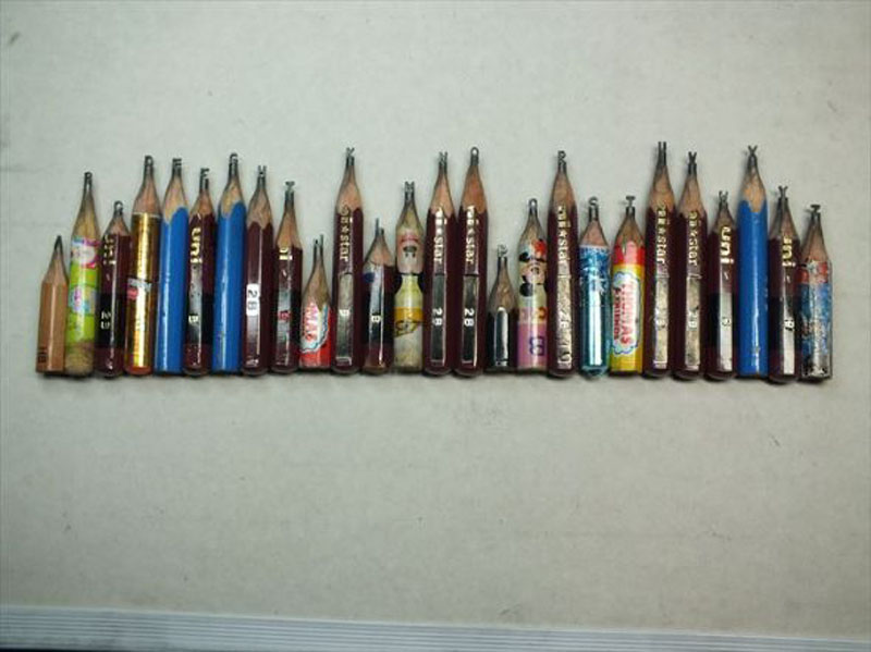 山崎氏は「5、6年前に、テレビで非常に精巧な米國の彫刻家の作品を見た。年末の大掃除をしていたらたまたま鉛筆がいっぱい出てきたので、鉛筆の芯の上に彫刻をする生活を始めました」と話す。