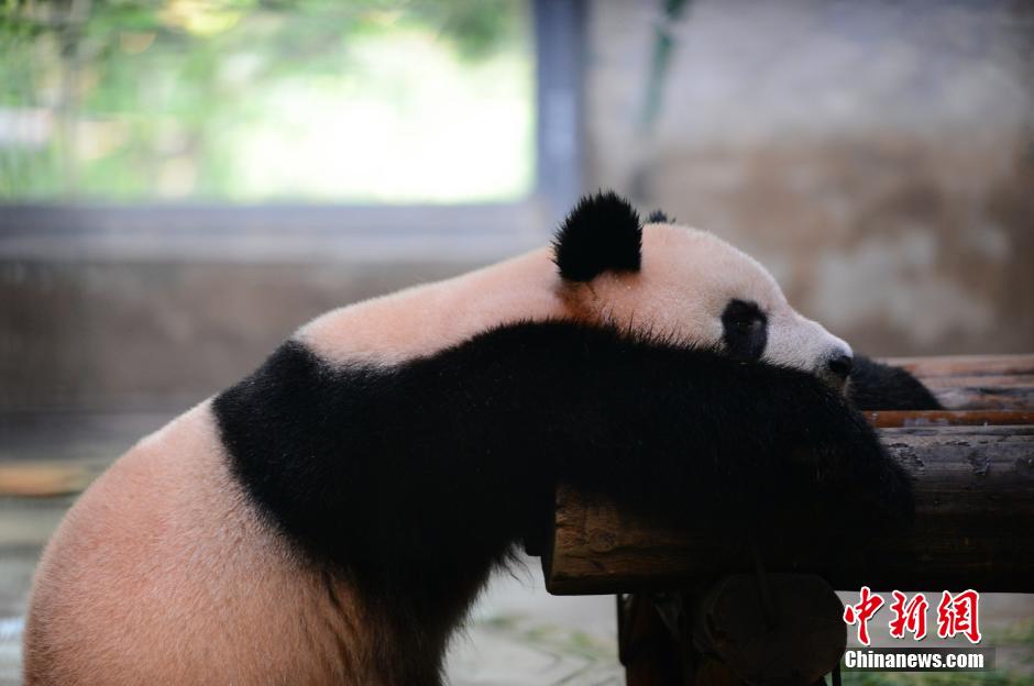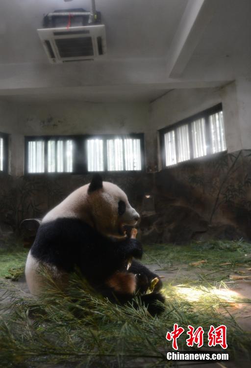 杭州動物園のパンダは7月14日、エアコンの風に當たり涼んでいる。7月13日に杭州は「三伏」(夏の最も暑い時期)を迎え猛暑モードに突入した。杭州動物園のパンダ館の飼育員は國寶(特別天然記念物)たちのために定期的にエアコンをつけ、気溫の上昇をおさえている。中國新聞網(wǎng)が伝えた。(編集JK)