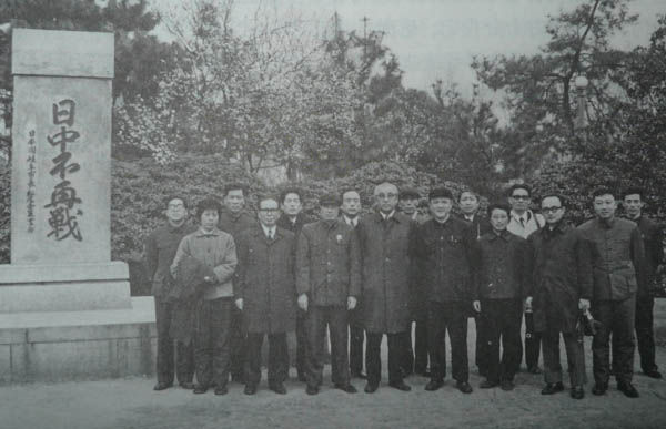 1973年3月、読売新聞社の副社長?原四郎氏を団長とする代表団が訪中し、柳浪聞鶯公園に建立されている「日中不再戦の碑」を見學した。(寫真の提供者:曽文彬氏)