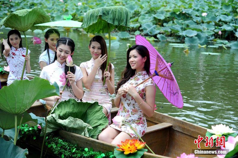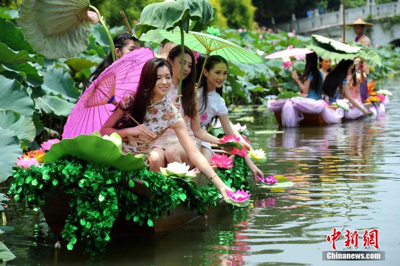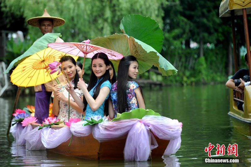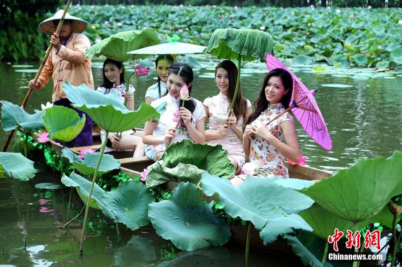 2015年の珠江イメージ大使のトップ10の選手たちが7月19日、広東省仏山市山水にある蓮の花ワールドに集合し、蓮の花の妖精に変身した。蓮の花とのダンス、船にゆられての観賞を行ない、また蓮の花の燈篭を水に流した。中國(guó)新聞網(wǎng)が伝えた。(編集JK)