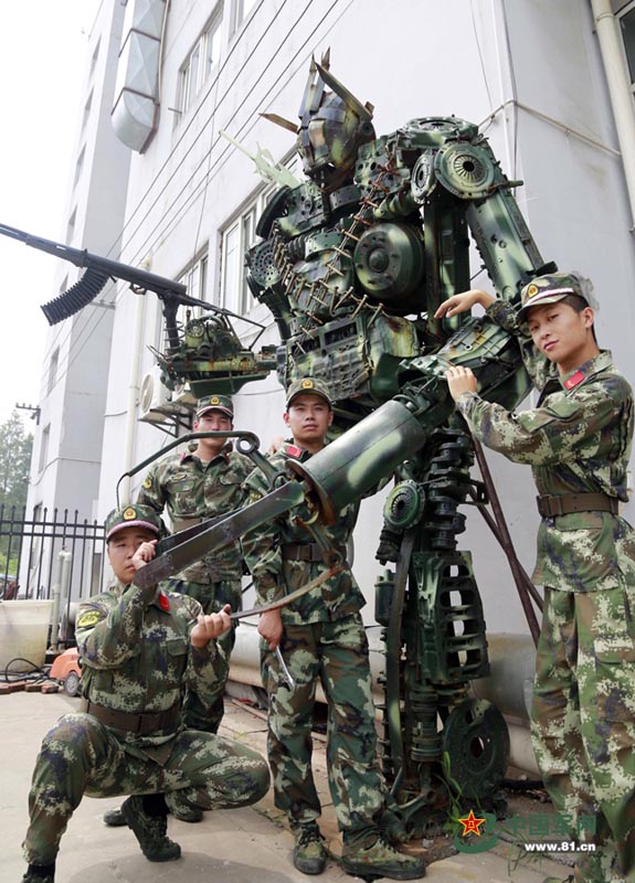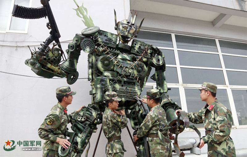 迷彩服を著た「トランスフォーマー」が7月22日、江蘇省國境警備隊の後方支援基地で初披露された。江蘇省國境警備隊後方支援基地車両訓練隊の隊員たちは休憩時間を利用して廃棄されたエンジン、歯車、ダンピングスプリングなどの自動車部品に組立、溶接を施し、3か月かけて高さ4メートルの迷彩服の「トランスフォーマー」を造った。廃棄物を有効利用しただけでなく、隊員たちの余暇生活も充実させた?,F(xiàn)在、この「トランスフォーマー」は車両訓練隊のマスコットになり、隊員たちは爭って一緒に記念寫真を撮影している。(編集JK)