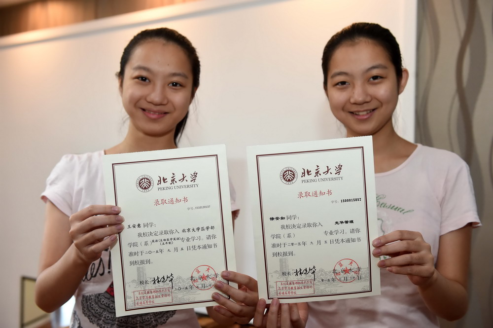 徐安如さんと王安意さんは雙子の姉妹だ。今年の大學入試において、姉の徐さんは北京大學光華管理學院(EMBA)の入學許可を、妹の王さんは同大學醫(yī)學部生物醫(yī)學英語専攻の入學許可を受け取った。新華網(wǎng)が伝えた。(編集JK)