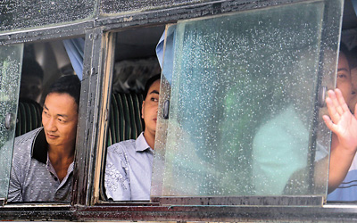 | バスから顔をのぞかせる釈放された中國(guó)人伐採(cǎi)者ら。 |